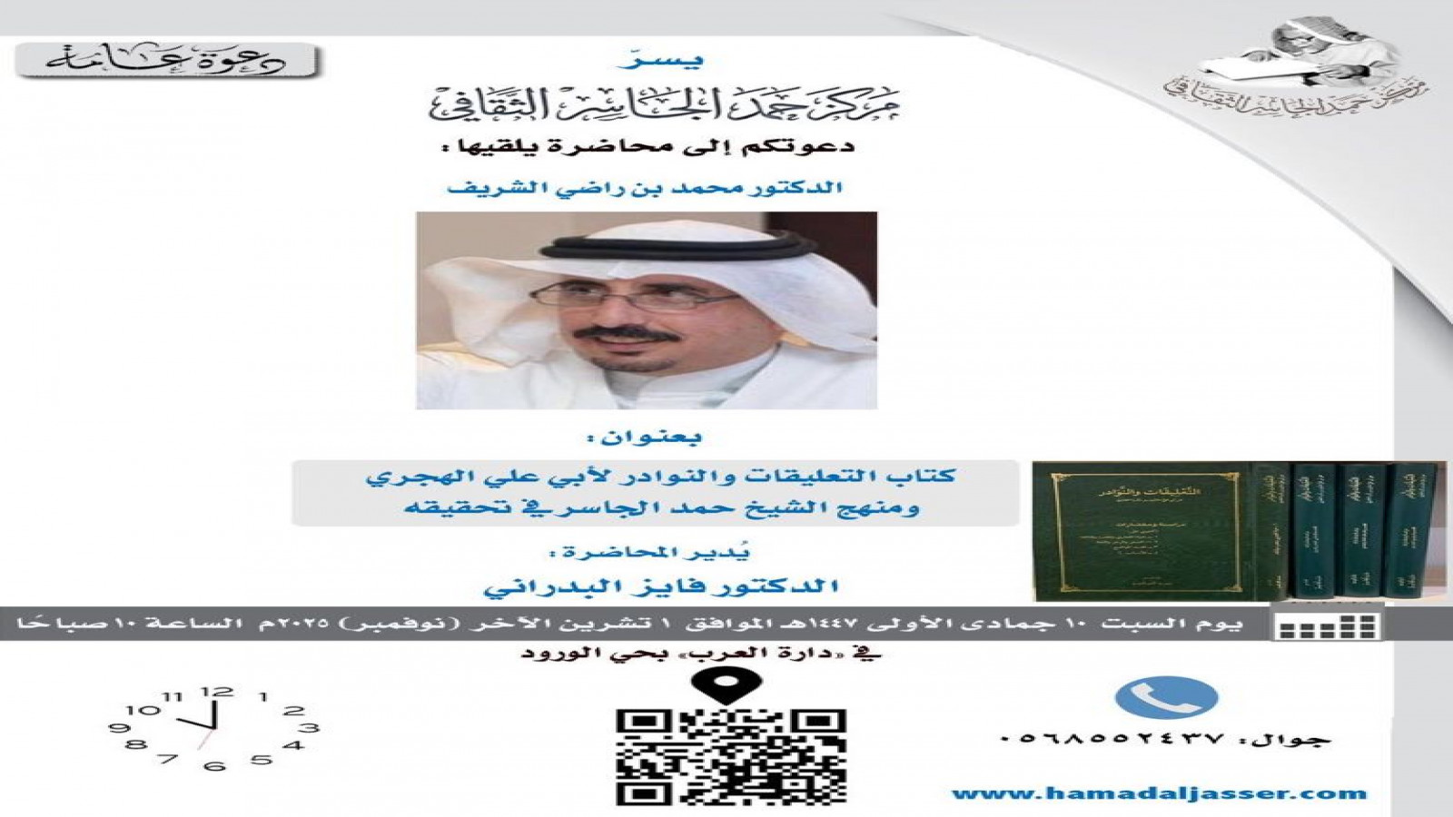 متابعات د. الشريف يحاضر عن كتاب «التعليقات والنوادر» ومنهج حمد الجاسر في تحقيقه. اليمامة خاص 2025-10-30